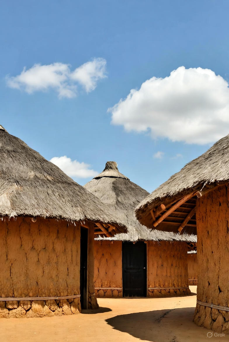 Mud huts with thatch roofs in rural areas, emphasizing communal living. Impact: Sustainable, low-cost designs.
